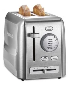 Beautiful design meets contemporary functionality with the Cuisinart Stainless Toaster. This stainless steel toaster includes 2 generously sized slots to varying thicknesses of breads. A unique single slice function allows you to toast 1 slice if needed, while a variety of preset selections – Bread, Bagel, Waffle, Pastry, English Muffin – thoroughly cook your bread to the precise setting. The Cuisinart Stainless 2 Slice Toaster comes equipped with a handy Defrost button for popping in frozen bread items like bagels and cooks them evenly without overdoing it. An adjustable shade setting ranging from 1 through 7 lets you select just the right amount of doneness for your personal taste and a convenient Cancel button lets you interrupt the toasting process whenever needed. This stylish and sleek toaster will be a great countertop item for you and your family to enjoy for quick mornings on the go or weekend breakfast gatherings!